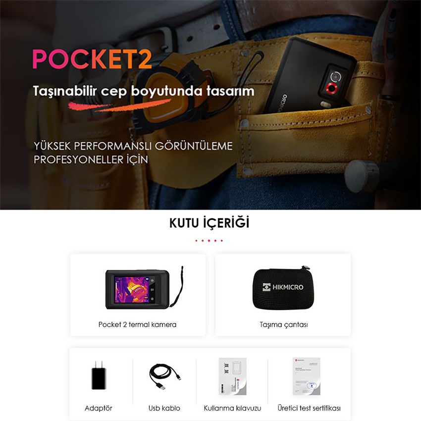 - HIKMICRO markasının Pocket2 termal kamera cihazı; tam bir teknik ekibi donatmak için ideal olan termal görüntüleme kamerasıdır. Küçük ve kullanışlıdır ancak aynı zamanda şantiyelerdeki zorlu çalışma koşulları için sağlam bir tasarıma sahiptir.