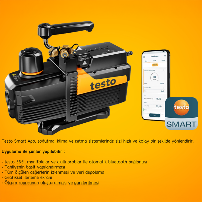 - Testo Smart Uygulaması, soğutma, klima ve ısıtma sistemlerindeki ölçümlerde sizi hızlı ve kolay bir şekilde yönlendirir. Testo 565i, manifoldlar ve akıllı problar ile otomatik bluetooth bağlantısı, tahliyenin basit yapılandırması, tüm ölçülen değerlerin izlenmesi ve veri depolama, grafiksel ilerleme ekranı, ölçüm raporunun oluşturulması ve gönderilmesi gibi işler mobil uygulama ile yapılabilir.