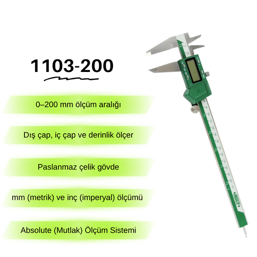 İnsize 1103-200 dijital kumpas, 0–200 mm ölçüm aralığı, mutlak ölçüm (ABS) teknolojisi ve sağlam paslanmaz çelik yapısı sayesinde profesyonel ve endüstriyel kullanımlar için yüksek doğruluk ve kullanım kolaylığı sağlar.
