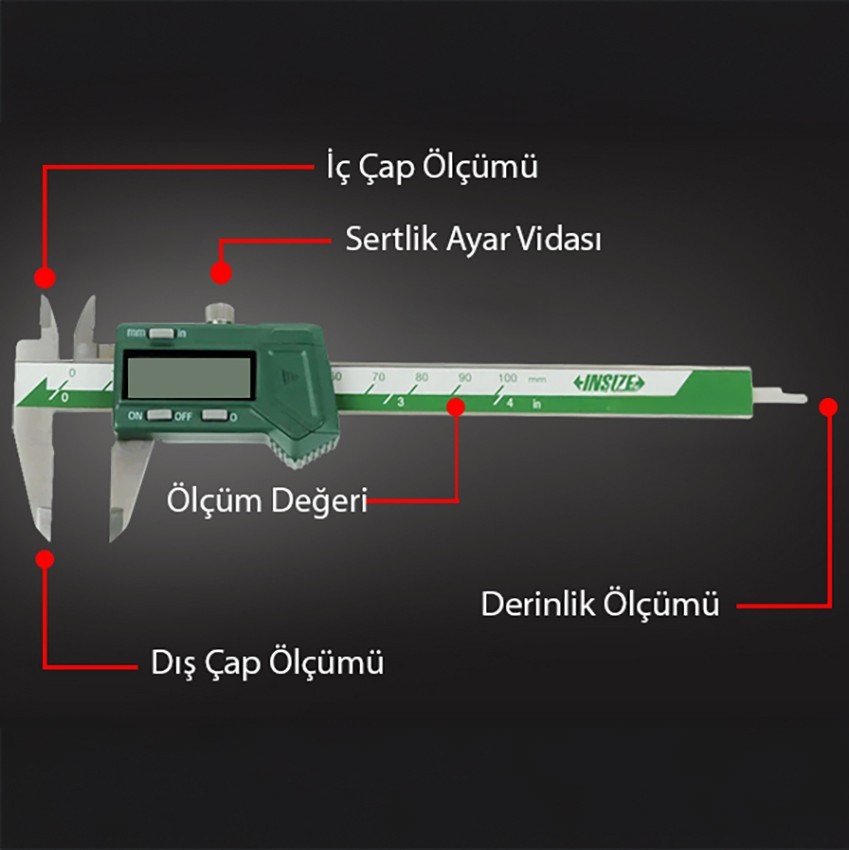 - İnsize 1111-100A dijital kumpasın mm ve inch ölçebilme fonksiyonu sayesinde iki farklı ölçüm birimi ile ölçüm yapabilirsiniz.