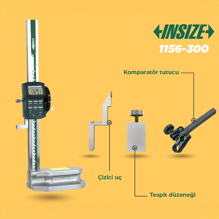 İnsize 1156-300 makaralı dijital mihengir; bu tarz cihazlar genellikle düz zeminlerde kullanılır ve metal vb. malzemelerin parça işaretlemesinde kullanılır. Yükseklik ölçüsü alırken üzerinde sabit kumpası olan, mm veya inch cinsinde hassas ölçülerin alınmasını sağlayan cihazdır.