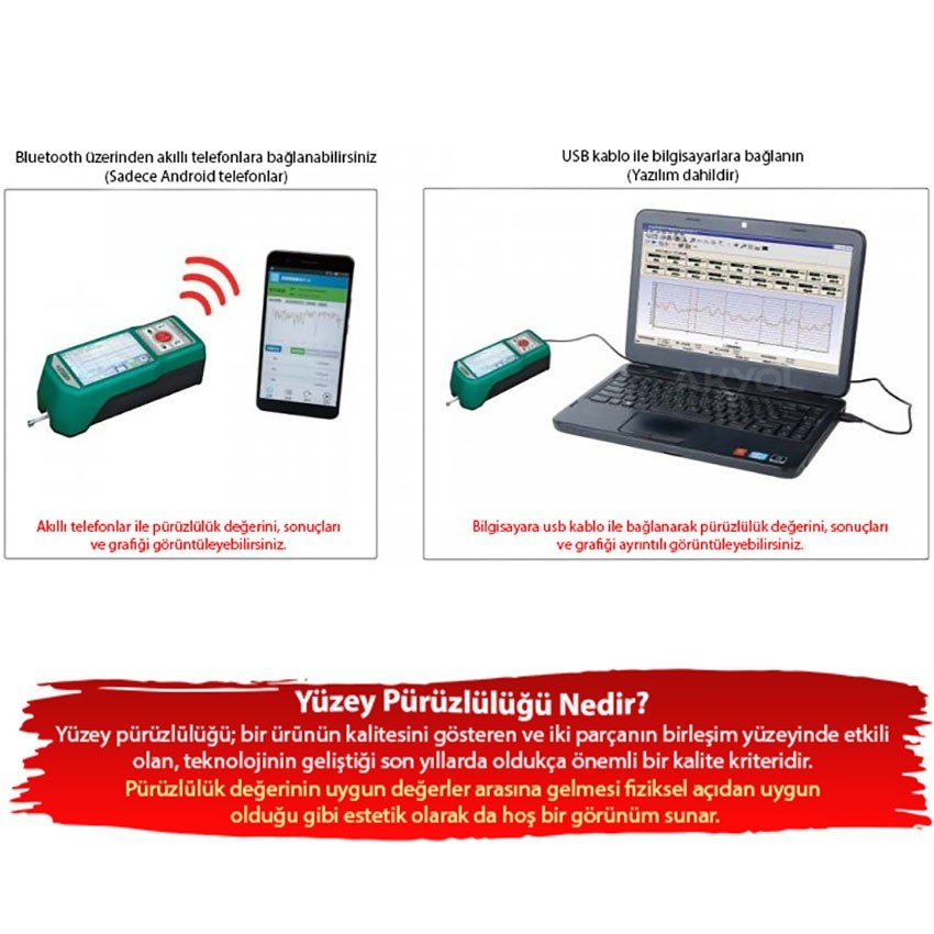 - İnsize ISR-C300 yüzey pürüzlülük ölçme cihazı bluetooth dokunmatik ekran bilgisayarlar veya mobil telefonlar (yalnızca Android) ile kullanılabilmektedir.