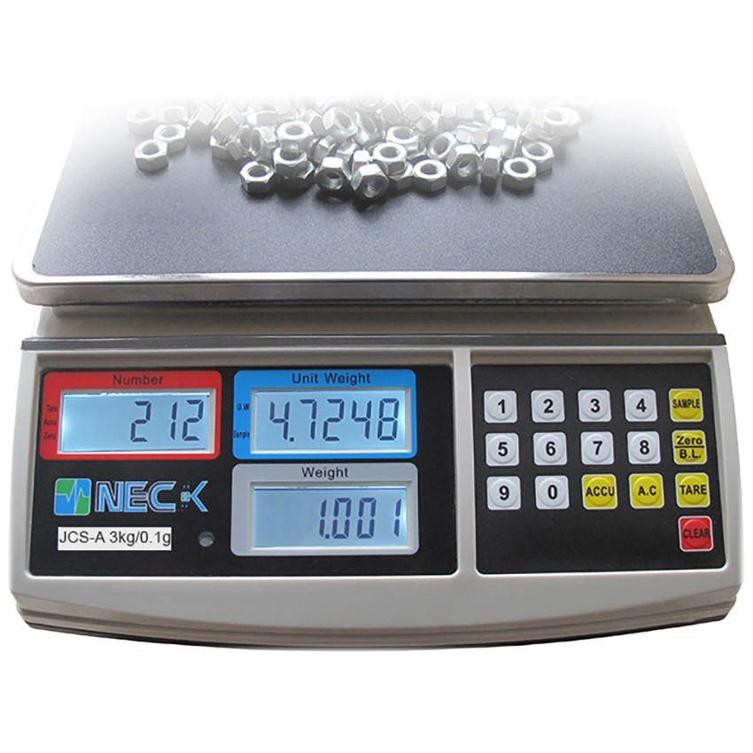 Necklife JCS-A sayıcı terazi; 0.1 gram hassasiyetiyle 3 kilograma kadar toplam ağırlığa sahip numunelerin adedini belirlemede kullanılan dijital hassas bir sayıcı terazidir.