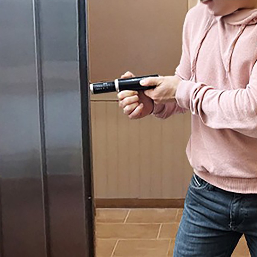 4- Kinetik enerji ölçümünde ise; cihaz yatay pozisyonda tutularak arka tarafı kapı kasasına yaslanır. Fotosele görünmeden kapının kapanması ve cihaza çarpması sağlanır. Okuma halkası yerinden oynamadan ve zaman kaybetmeden ilgili skaladan Joule değeri okunur.