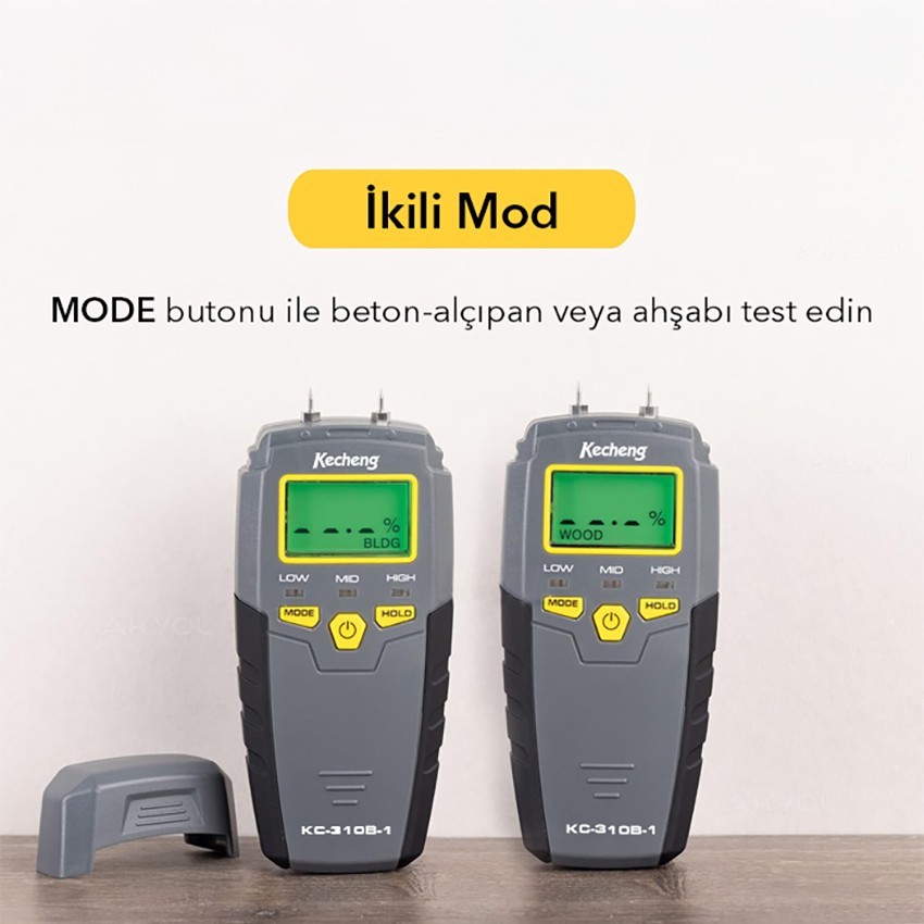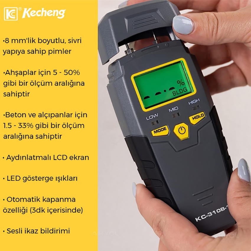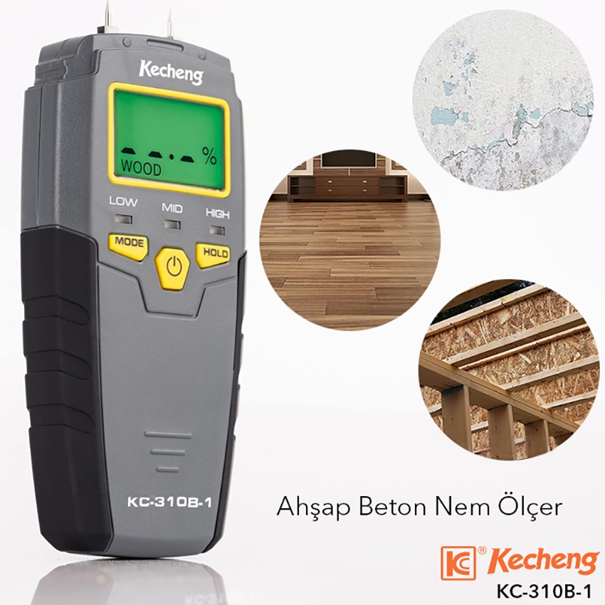 Kecheng KC-310B-1 ahşap beton nem ölçüm cihazı, 8 mm'lik sivri ölçüm probu sayesinde ahşap, beton ve diğer yapı malzemelerinin nemini hızlı ve hassas bir şekilde ölçebilen, taşınabilir bir dijital nem ölçüm cihazıdır.