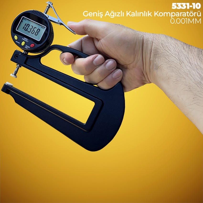 5331-10 geniş ağızlı kalınlık komparatörü; 0' dan 10 mm' e kadar hassas bir şekilde malzeme kalınlığı ölçmek için tasarlanmış geniş kalınlık komparatörüdür.