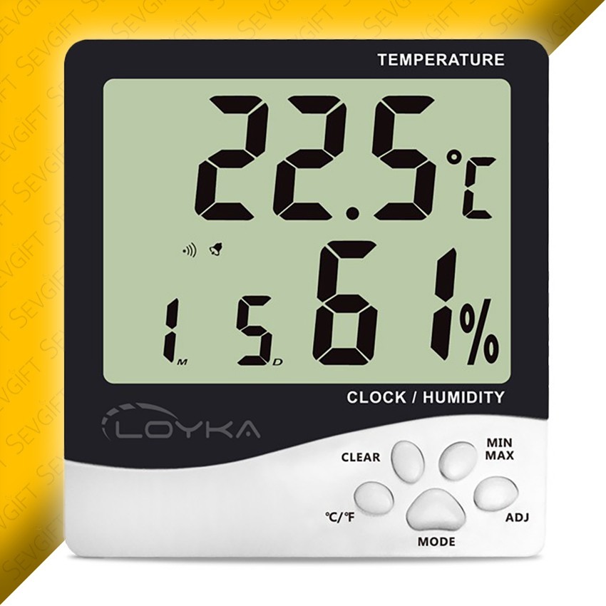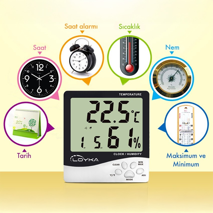 aynı zamanda LCD ekranında ay, yıl ve saati sürekli olarak ekranda gösterebilen, şık bir tasarıma sahip sıcaklık ve nem ölçüm cihazıdır.