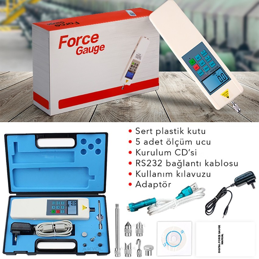 - Bu kuvvet ölçüm cihazının kutusundan çıkan parçaları şu şekilde sayabiliriz : HF 1000 dinamometre, şarj adaptörü, 6 adet çeşitli şekillerde başlık, 1 adet RS232 kablosu, yazılım kurulum CD'si ve kullanım kılavuzu.