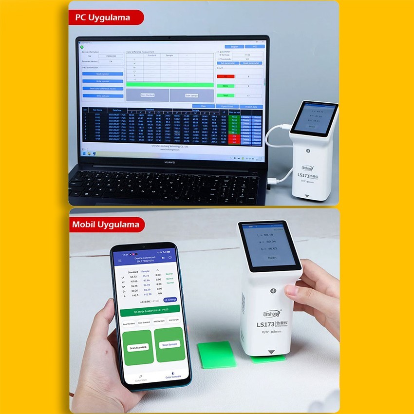 Linshang LS175 renk ölçüm cihazı, 20mm genişliğindeki ölçüm açıklığı sayesinde tekstil, kumaş ürünleri gibi dokulu veya pürüzlü yüzeye sahip malzemelerin rengini en hassas şekilde belirlemek için tasarlanmış, dokunmatik renkli ekranlı profesyonel bir renk tespit cihazıdır.