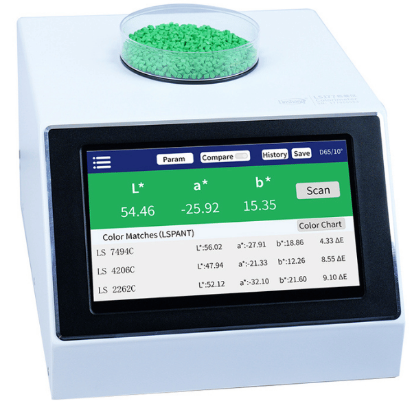Linshang LS177 spektrofotometre; 50 mm geniş ölçüm açıklığı sayesinde toz, granül, opak sıvılar (boya, mürekkep, süt, mayonez, jel vb.) ve desenli kumaşlar gibi yüzeylerde yüksek doğrulukta ve hızlı renk ölçümü yapan, 7 inç dokunmatik renkli ekrana sahip masaüstü profesyonel renk ölçüm cihazıdır.