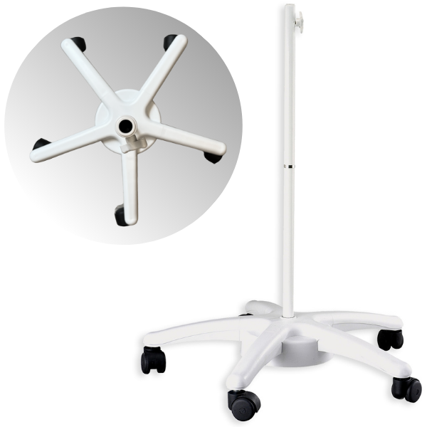 T5 Premium büyüteç ayağı; geniş tabanı ve 5 tekerlekli tasarımı sayesinde devrilmeye karşı güvenli, sessiz ve kolay hareket imkânı sunar. Profesyonel kullanım için özel olarak geliştirilen bu aparat, büyüteçlerin güvenli, stabil ve ergonomik şekilde taşınmasını ve sabitlenmesini sağlar.