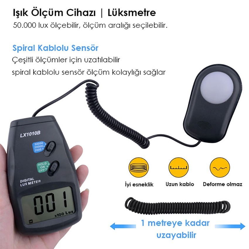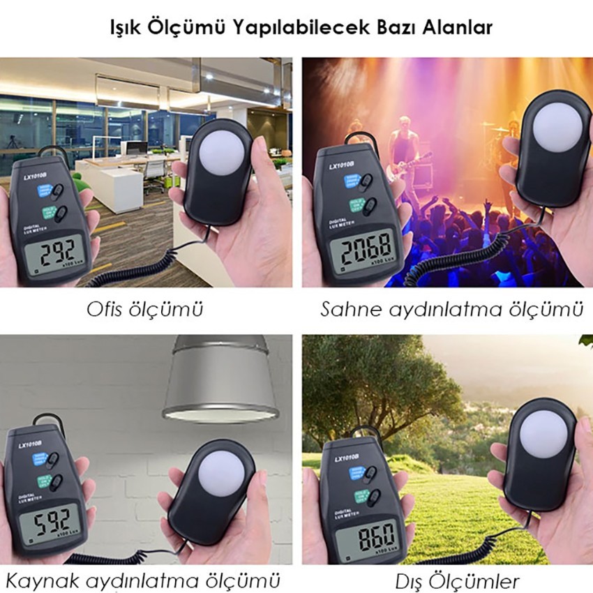 Benetech GM1010 ışık ölçüm cihazı; yaygın olarak, kalite kontrol işlemlerinde, okullarda deney ve eğitim işlerinde , inşaat sektöründe, aydınlatma kontrollerinde vb. işlemlerde ışık miktarını tespit etmek için kullanılan, hassas ve taşıması kolay lüksmetredir.