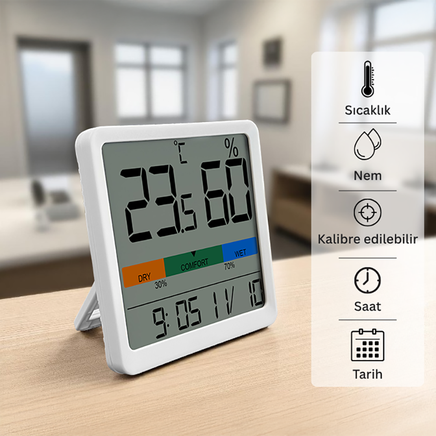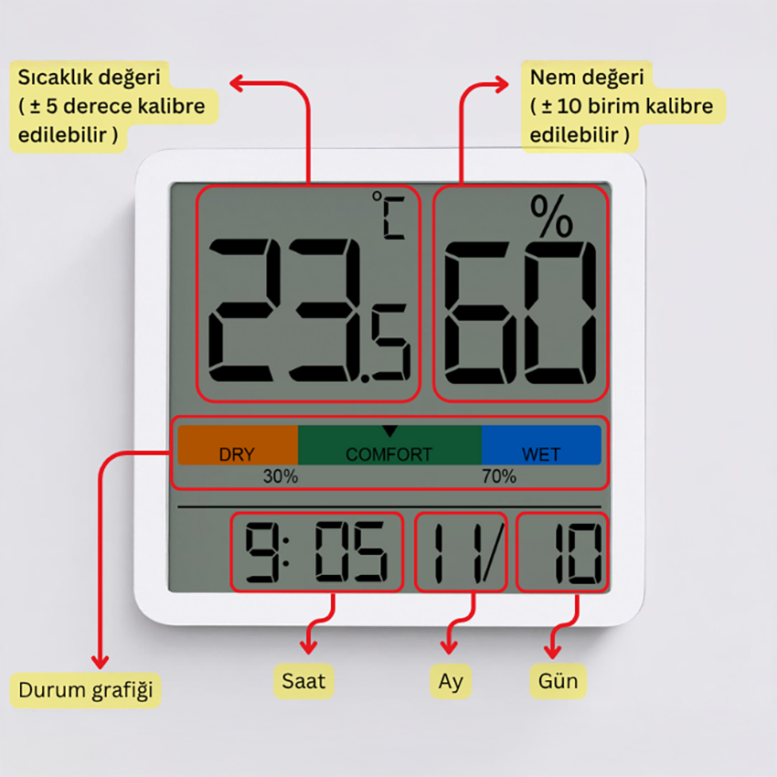 Ölçtüğü sıcaklık ve nem değerlerini LCD ekranında net bir şekilde gösterirken, ekrandaki grafik barı da mevcut değerlere göre dinamik olarak değişim gösterir.