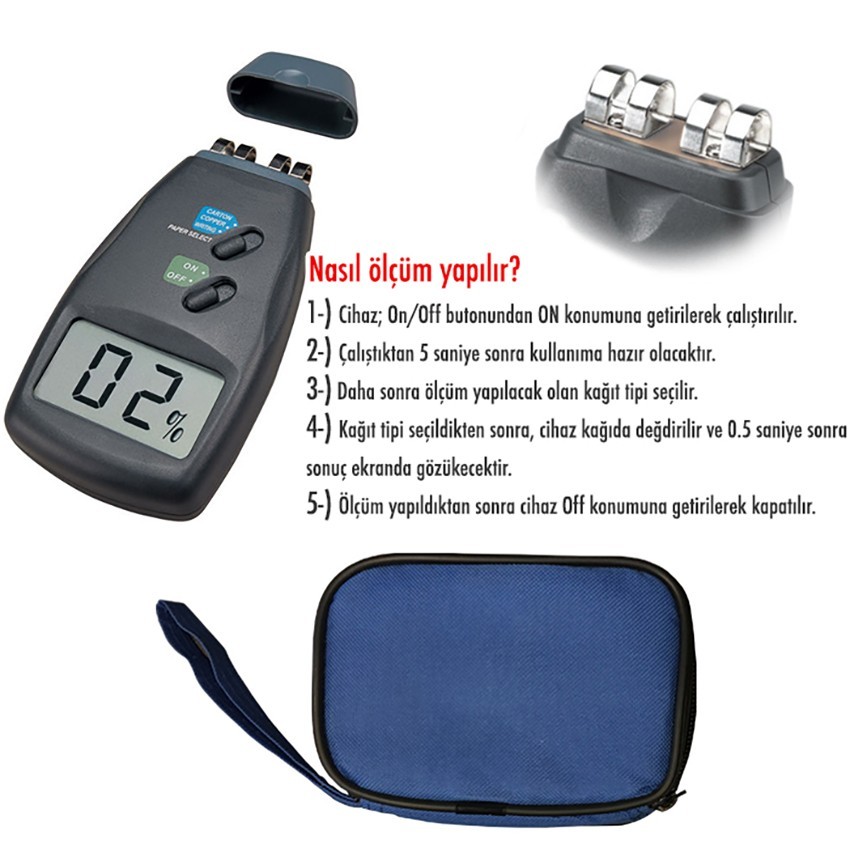 - MD-6G kağıt nem ölçer ile birlikte gelen mavi renkteki taşıma çantası, cihazın saklanması ve taşınmasında kolaylık sağlayacaktır.