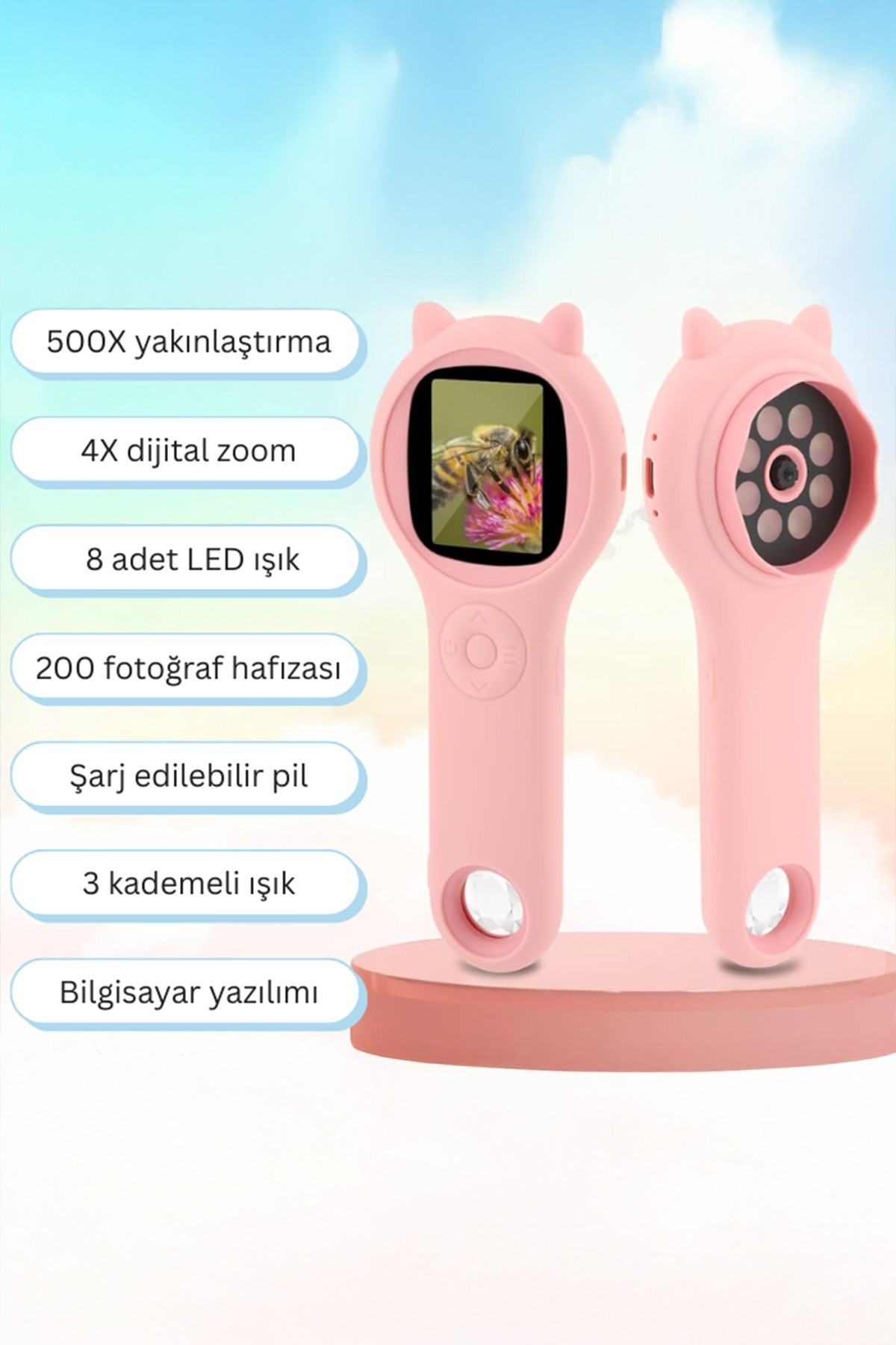 - En dikkat çekici özelliklerinden biri olan 500X yakınlaştırma kapasitesi ve 4x dijital zoom ile çıplak gözle görülemeyen en küçük detayların bile ortaya çıkmasını sağlar. Bitki yapraklarının hücre detaylarından böceklerin ince kanat yapılarına, kumaşların liflerinden küçük mekanik parçaların yüzey analizine kadar pek çok alanda kullanılabilir.