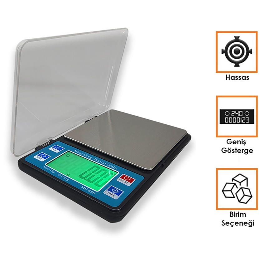 MH-698 dijital terazi; 1 kilogram maksimum tartım kapasitesi ve 0,01 gram tartım hassasiyetine sahip, tartım bölümüne koruyan kapağı sayesinde taşınabilme imkanı da bulunan tartım cihazıdır.