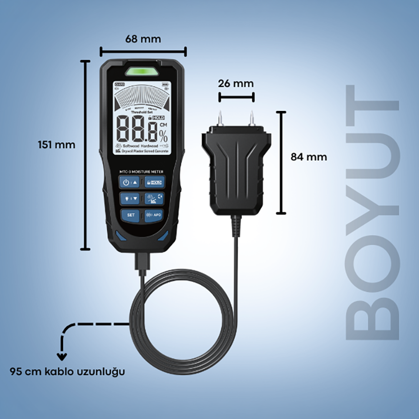 Yumuşak Ahşap, Sert Ahşap, Parçacık Panosu, Anhidrit Sıva, Çimento Sıva, Kireç Briket, Gaz Betonu, Beton, Yüksek Yalıtım Tuğlaları, Katı Tuğlalar gibi malzemelerin nemini profesyonel ve hassas bir şekilde ölçen cihazdır.