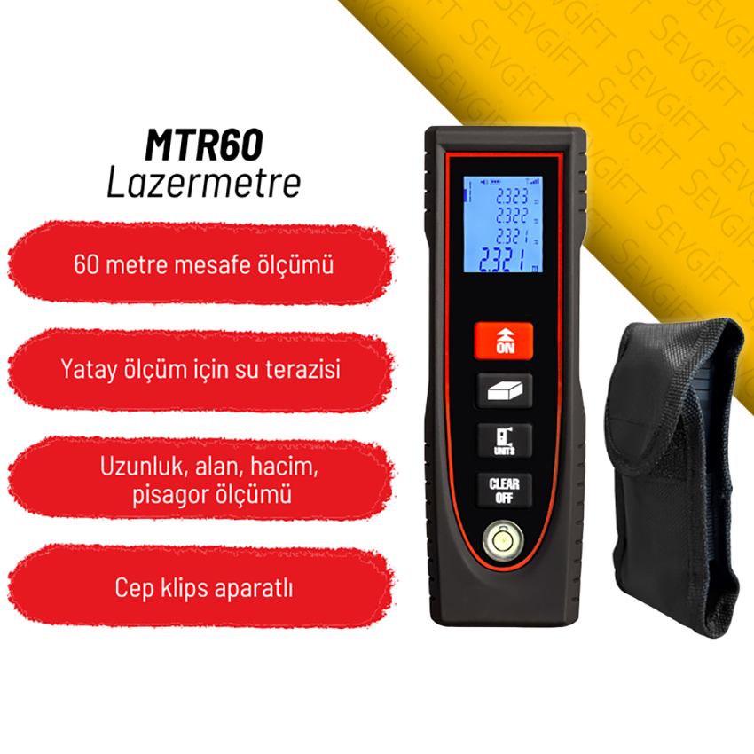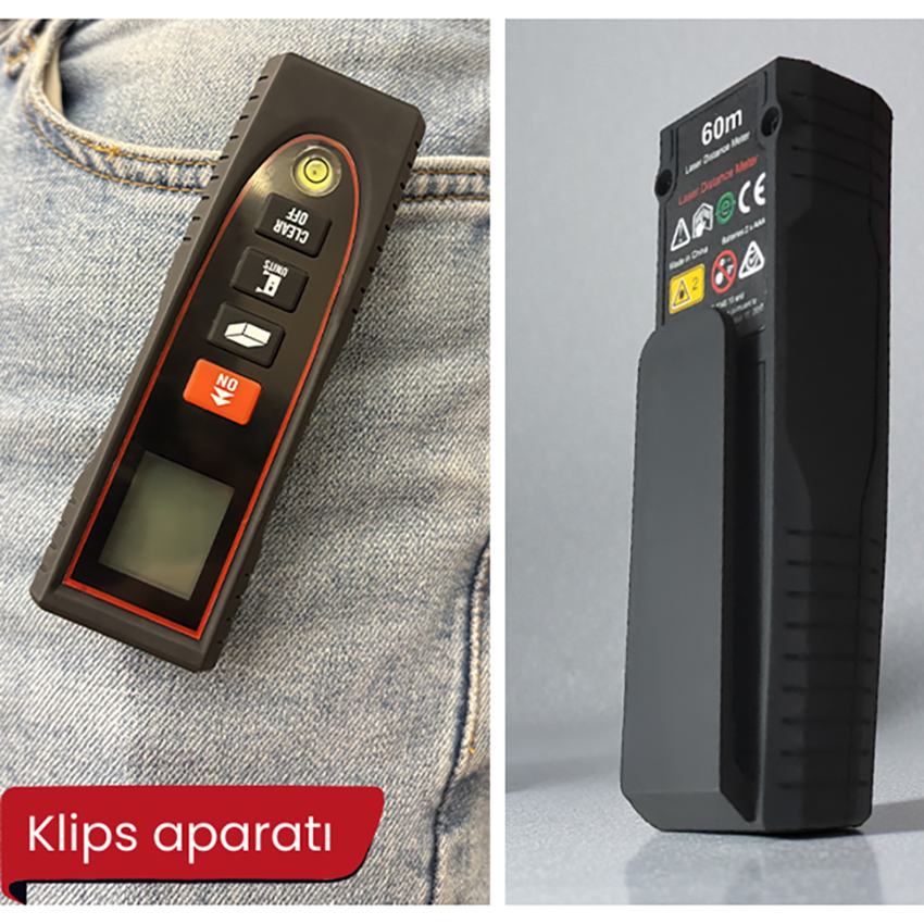 MTR60 klipsli lazer mesafe ölçer; 60 metreye kadar mesafe ölçümü yapabilen, dahili su terazisi bulunan ve kırmızı lazer teknolojisiyle donatılmış,