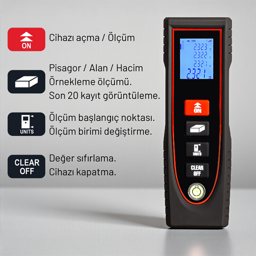 uzunluk, alan, hacim ve Pisagor hesaplamalarını destekleyen pratik bir lazer metre modelidir.