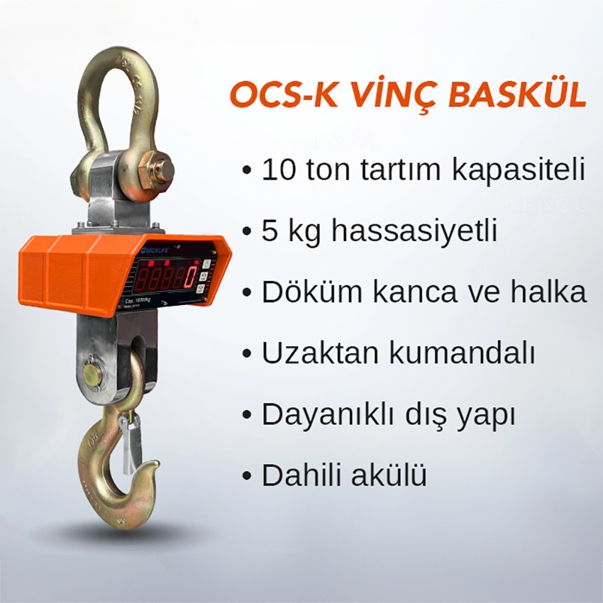 OCS-K vinç baskülü maksimum 5 tona kadar tartım yapabilen ve 2 kilogram hassasiyetli uzaktan kumandaya sahip bir tartım cihazıdır. Döküm halka ve döküm kancası ile dayanıklı bir dış yapıya sahip kaliteli bir vinç basküldür.