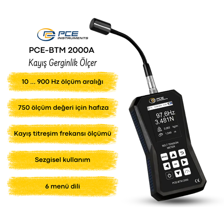 PCE-BTM 2000A kayış gerginliği ölçer, sanayi ve mühendislik alanlarında kullanılan, kayışların doğru gerginlik seviyesinde çalışmasını sağlamak için tasarlanmış bir cihazdır. Özellikle makinelerde kullanılan kayışların gerginliğini ölçmek, bu kayışların performansını optimize etmek ve olası aşınma veya kayış kopmalarını önlemek açısından kritik bir öneme sahiptir.