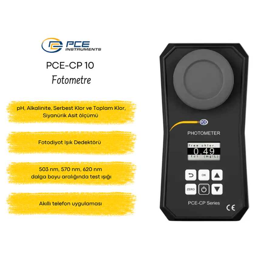 - Özellikle su arıtma tesisleri, yüzme havuzları, laboratuvarlar ve endüstriyel su uygulamalarında tercih edilen PCE-CP 10 fotometre, mobil kullanımı ve geniş ölçüm kapasitesi ile kullanıcıların işini kolaylaştırır.