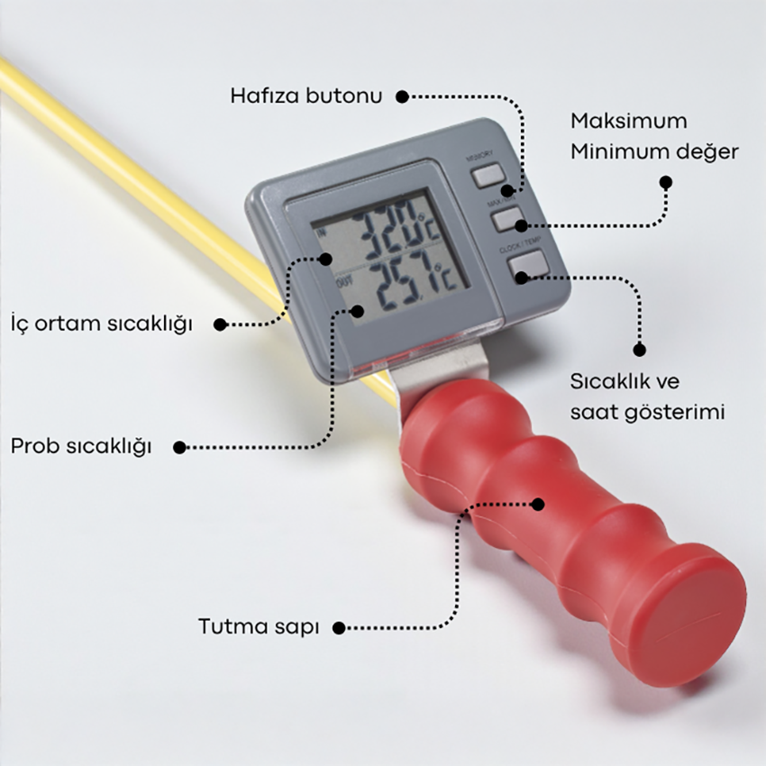• Kolay kullanım prensibi sayesinde ek eğitim gerektirmez; prob yığına daldırılır ve sıcaklık stabil olduğunda ekrandan değer okunur.