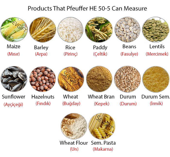 - Pfeuffer HE 50-5 tahıl nem ölçüm cihazı; 14 farklı hububatın nemini ölçebilme yeteneğine sahiptir. Nemini ölçebildiği ürünler; Mısır (Maize), Arpa (Barley), Pirinç (Rice), Çeltik (Paddy), Fasulye (Beans), Mercimek (Lentils), Ayçiçeği (Sunflower), Fındık (Hazelnuts), Buğday (Wheat), Kepek (Wheat Barn), Durum (Durum), İrmik (Durum sem.), Un (Wheat Flour) ve Makarna (Sem Pasta) 'dır.