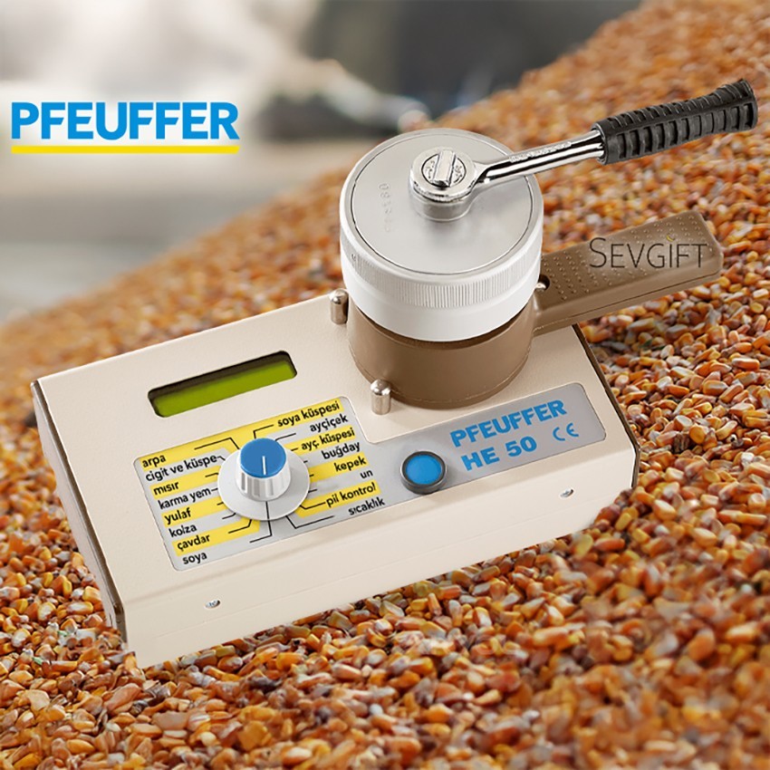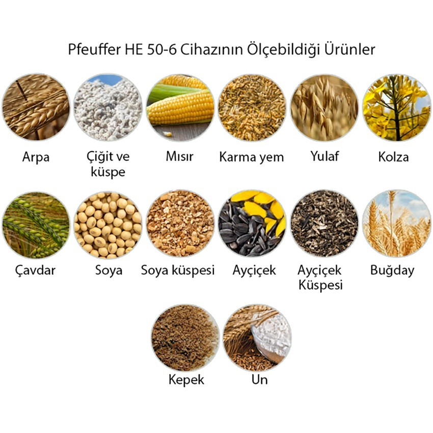 - Pfeuffer HE 50-6 kırmalı tahıl nem ölçüm cihazı; 14 farklı hububatın nemini ölçebilme yeteneğine sahiptir. Nemini ölçebildiği ürünler; Arpa, Çiğit ve Küspe, Mısır, Karma Yem, Yulaf, Kolza, Çavdar, Soya, Soya Küspesi, Ayçiçek, Ayçiçek Küspesi, Buğday, Kepek ve Un'dur.