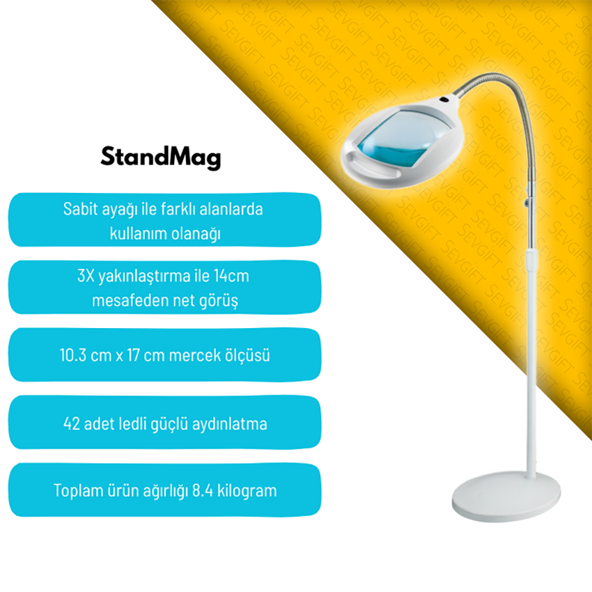 - StandMag büyüteç, sağ tarafında 21 ve sol tarafında 21 olmak üzere toplamda 42 adet beyaz led ışık ile donatılmıştır.