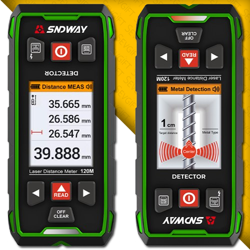 SNDWAY SW-6100GT multi ölçüm cihazı, 120 m’ye kadar uzaklıklarda ±2 mm hassasiyetle ölçüm yapabilen gelişmiş bir lazermetredir ve 2,4″ renkli ekranı ile mesafe, alan, hacim ve Pisagor hesaplamalarını hızlı ve net şekilde gösterir. Ayrıca entegre duvar içi tarama dedektörü sayesinde ahşap, metal ve elektrik kablolarını duvar içinde tespit ederek hem ölçüm hem de yapı içi malzeme bulma ihtiyaçlarını tek cihazda toplar.