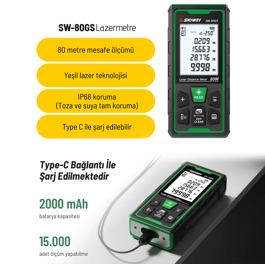 - SNDWAY SW-80GS lazermetre, 3.7V 2000 mAh lityum bataryası ve Type-C şarj girişi sayesinde modern, hızlı ve pratik bir kullanım sunar. Yaklaşık 3 saatlik tam şarj ile 15.000’e kadar ölçüm kapasitesi, sahada kesintisiz ve uzun süreli çalışma imkânı sağlar.