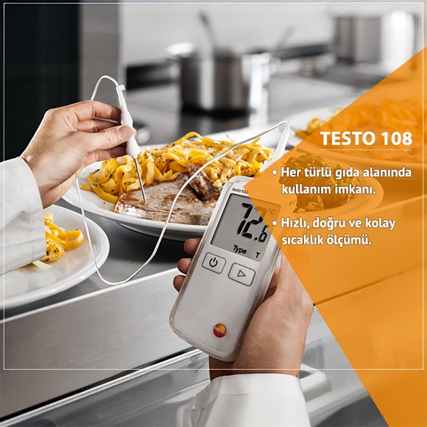 Testo 108 prob okuyucu termometre; hem K tipi hem de T tipi prob bağlanabilen bağlanılan bu problar ile sıcaklık ölçümü yapabilen tek kanallı termometredir.
