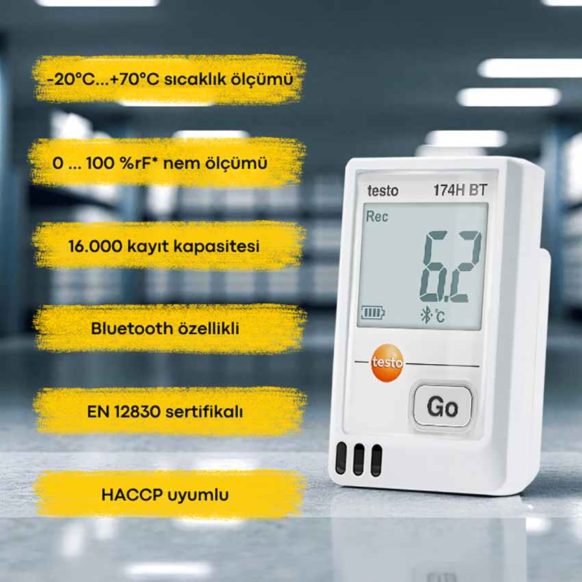 - Bu özellikleri sayesinde Testo 174H BT, HACCP uyumluluğu sağlayarak kalite kontrol süreçlerinde güvenilir, düzenli ve izlenebilir veri takibi sunar.