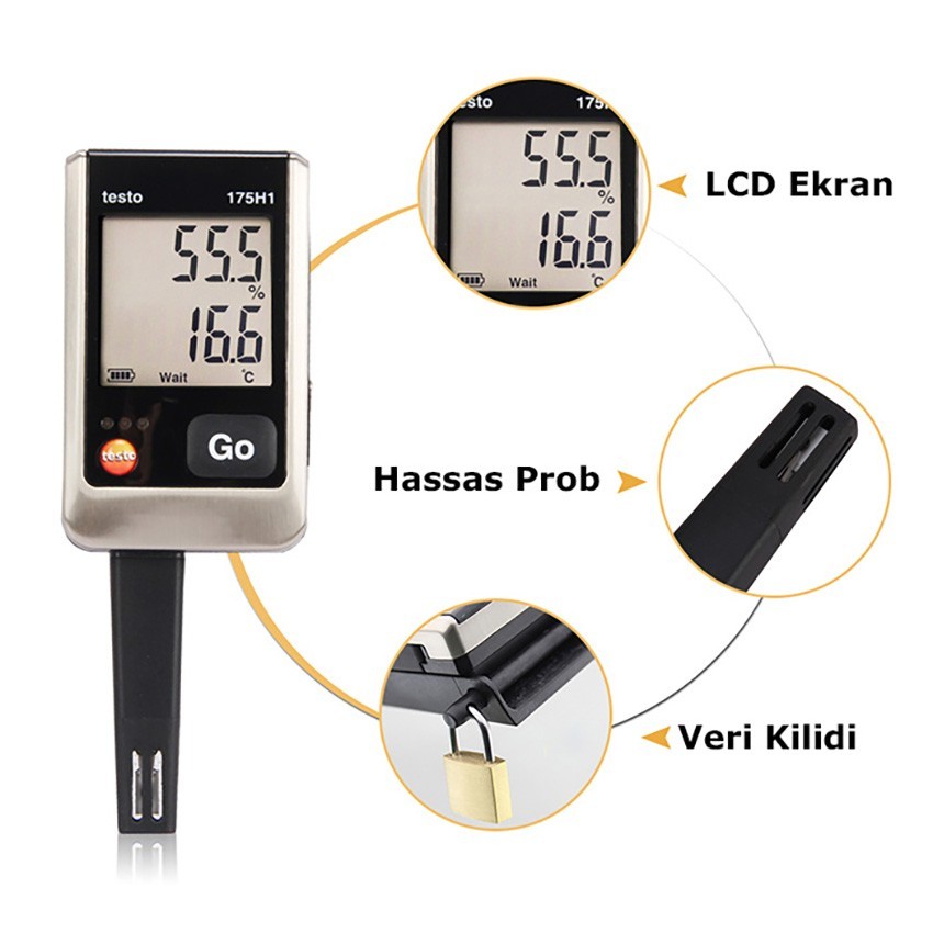 Testo 175 H1 datalogger; bulunduğu ortamın sıcaklık ve nem değerlerini kayıt altında tutmaya yarayan, anten tipi sabit harici sıcaklık ve nem sensörü ile yüksek hassasiyetli ölçüm yapan ısı ve nem kayıt cihazıdır.