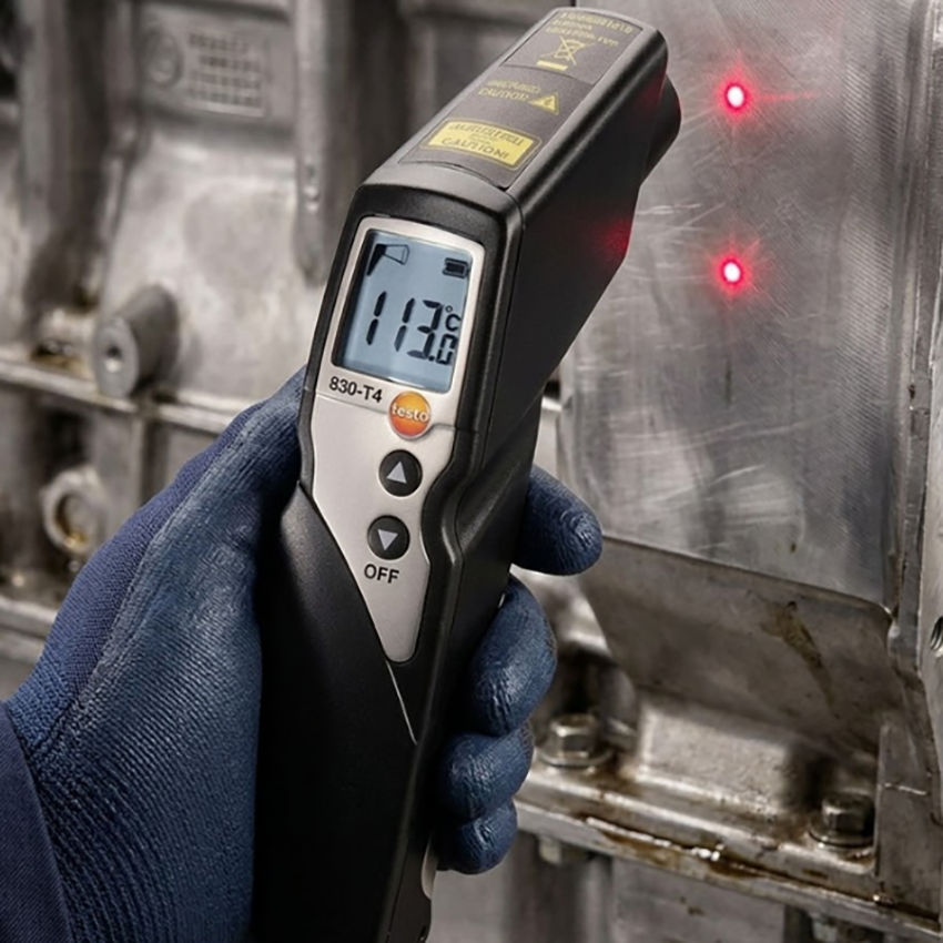 Testo 830-T4 kızılötesi termometre; -30°C ile +400°C arası temassız yüzey sıcaklığı ölçümü yapar. 30:1 optik oranı, çift lazer hedefleme ve ayarlanabilir emissivite ile endüstriyel ölçümler için yüksek hassasiyet sunar.