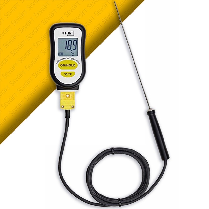 TFA 14.1552.01 mini k tipi prob okuyucu 1 adet K tipi prob bağlanabilen ve bu prob ile sıcaklık ölçümü yapabilen termometredir. IP65 koruma sınıfına sahip olan bu termometreyi sıvılar içinde kullanabilirsiniz.