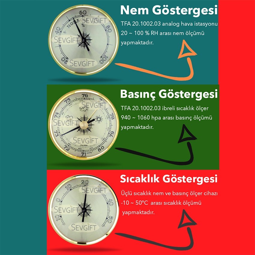 Tfa 20.1002.03 ibreli üçlü ölçüm cihazı; en üst kısmında nem değerini, orta kısımda basınç değerini ve en alt kısımda da sıcaklık değerini aynı anda görebileceğiniz kaliteli bir analog hava istasyonudur.