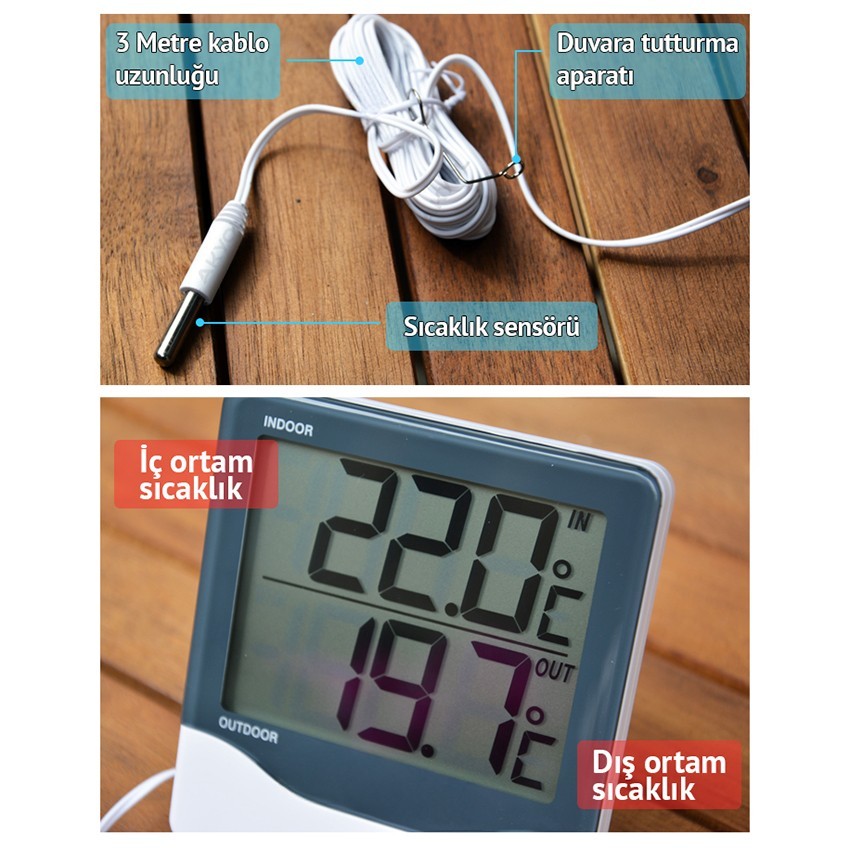 Tfa 30.1011 iç dış sıcaklık ölçer; hem bulunduğu yerin dijital olarak sıcaklığını gösterir, hem de kablonun ucundaki metal sensörün sıcaklığını gösterir.