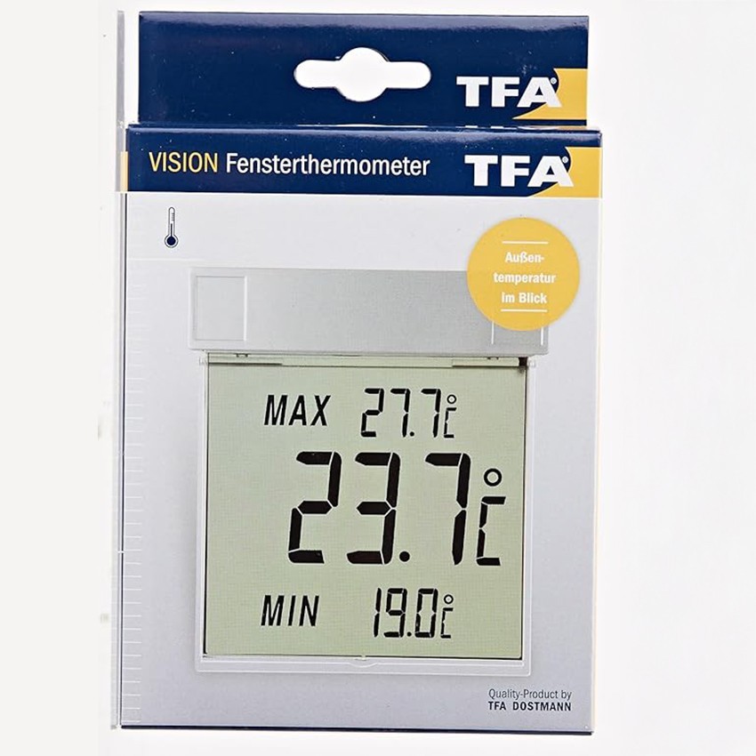 Dışarıdaki hava sıcaklığını öğrenmek hiç bu kadar kolay olmamıştı! TFA’nın 30.125 VISION modeliyle, dış ortam sıcaklığı büyük rakamlarla doğrudan pencere camında görüntülenir. İnce, hafif ve şık tasarımıyla bu termometre pencerenin dış kısmına monte edilir ve sıcaklık içeriden kolayca okunabilir. Günün en yüksek ve en düşük sıcaklık değerleri de gösterilir ve her gün otomatik olarak sıfırlanarak güncellenir.