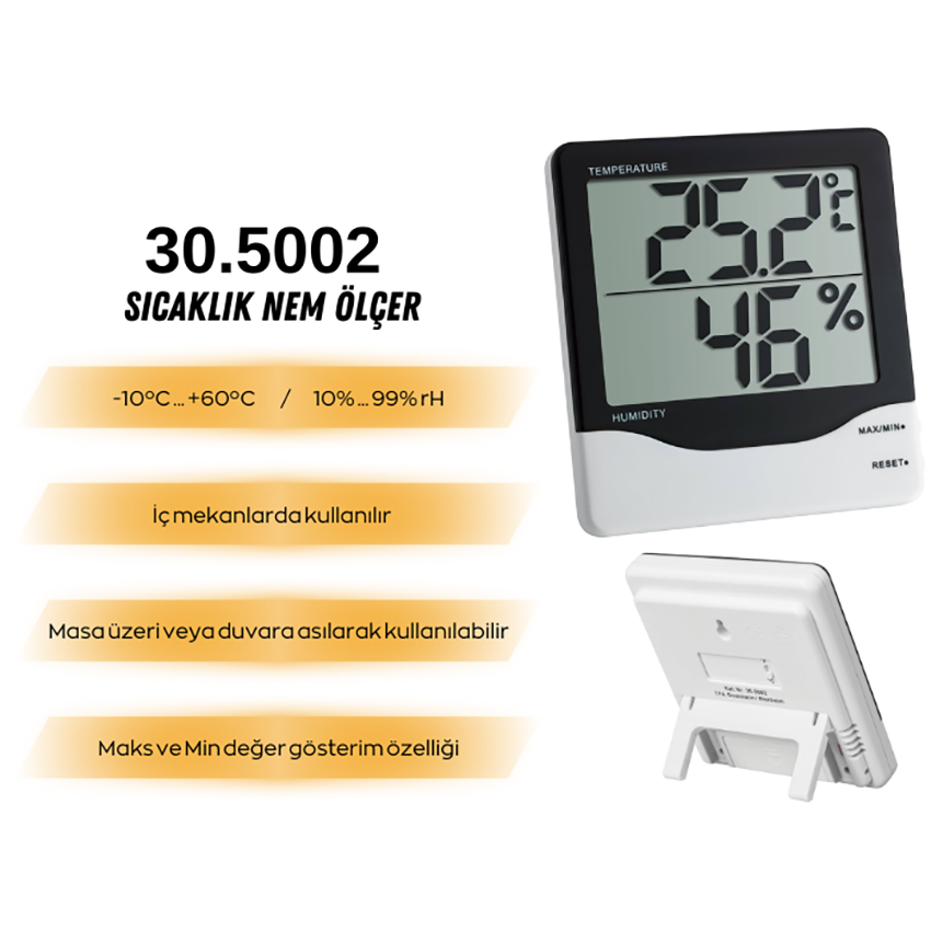 - Bu 30.5002 model elektronik termometre ve higrometre, hem duvara monte edilebilir hem de masaüstünde kullanılabilir, böylece kullanım kolaylığı sağlar.