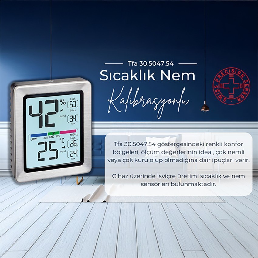 - Tfa 30.5047.54 isimli mekan sıcaklık ve nem ölçer cihazı ısı ve nem sensörü İsviçre üretimi hassas sensörlerdir.