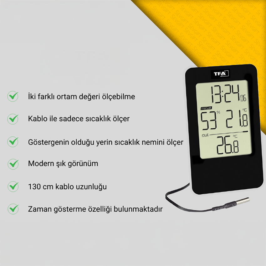 TFA 30.2018 İç ve Dış Ortam Sıcaklık Ölçer; 2.5 metre uzunluğundaki kablosu vasıtasıyla iki farklı ortamın sıcaklık değerlerini gösteren almanyadan ithal hassas bir sıcaklık ölçer çeşitidir.