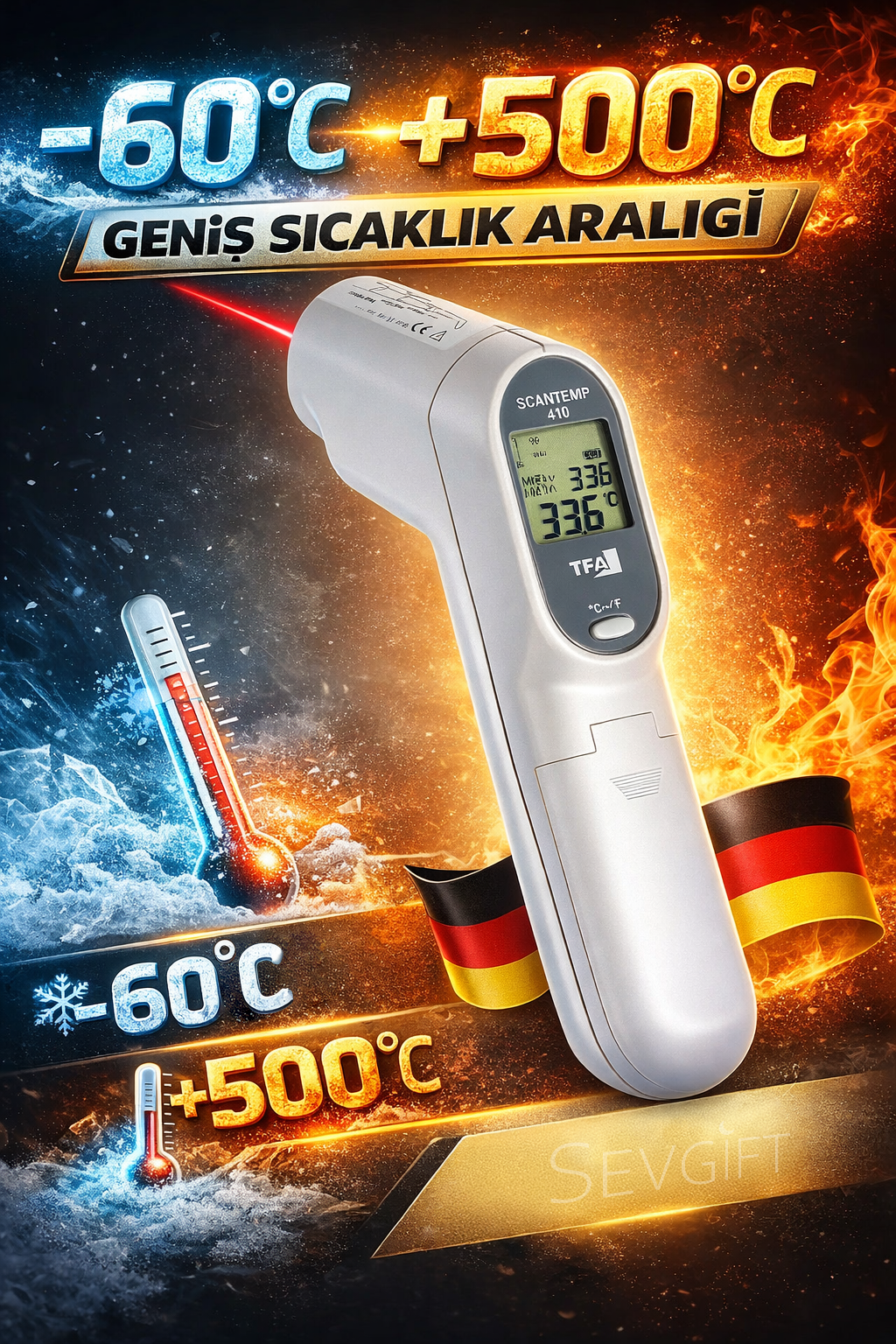 TFA 31.1115 lazerli uzaktan sıcaklık ölçer isimli Almanya'dan ithal bu cihaz maksimum 500°C ölçüm kapasitesine sahiptir. Gıda, metal, otomotiv, kimya ve kalıpçılık gibi setörlerde genellikle kullanılmaktadır. Cihazla birlikte yanında taşıma çantası da tarafınıza gelmektedir.
