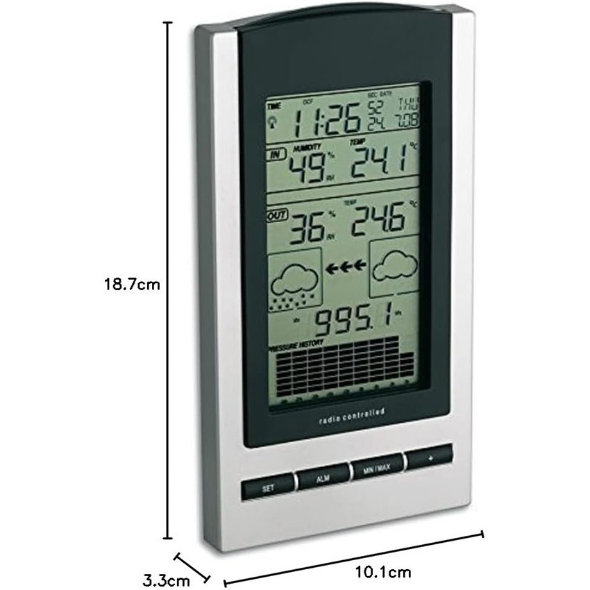 - Net ekran sayesinde yerel hava koşullarıyla ilgili birçok ayrıntıyı görebilirsiniz. Dış ortam sıcaklığı ve nem oranı, sahaya yerleştirilen ayrı bir kablosuz verici aracılığıyla belirlenir. Buna ek olarak, entegre bir elektronik barometre hava basıncını ölçer ve mevcut hava durumunu simgeyle gösterir; barometrik basınç değişimlerine göre gelecekteki hava durumu tahmini de başka bir simgeyle sunulur.