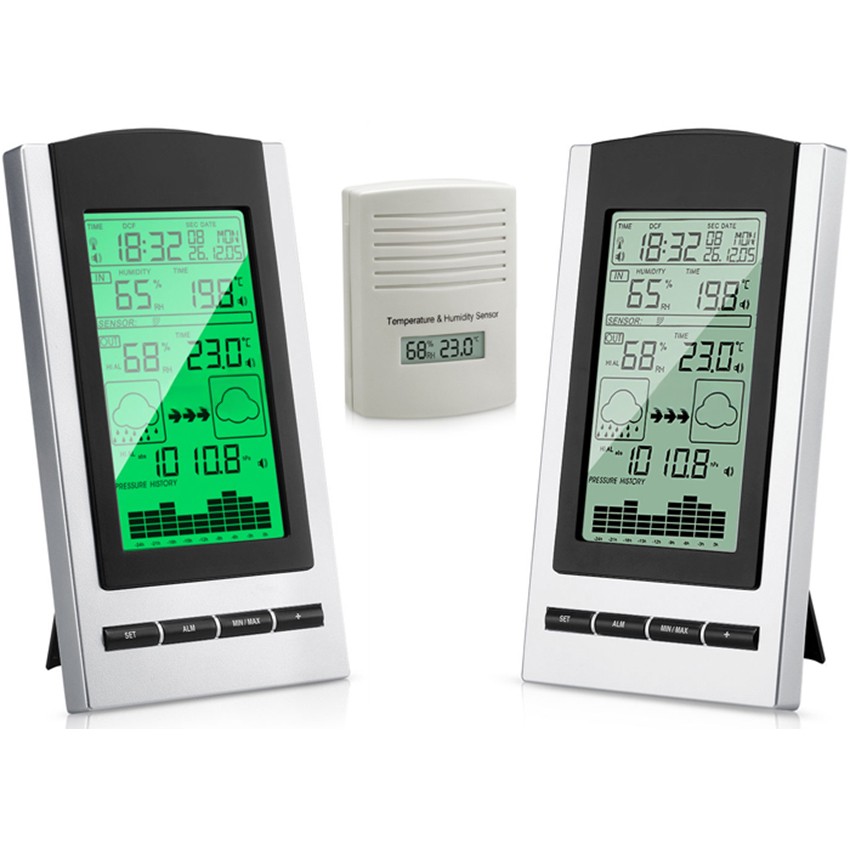 - Net ekran sayesinde yerel hava koşullarıyla ilgili birçok ayrıntıyı görebilirsiniz. Dış ortam sıcaklığı ve nem oranı, sahaya yerleştirilen ayrı bir kablosuz verici aracılığıyla belirlenir. Buna ek olarak, entegre bir elektronik barometre hava basıncını ölçer ve mevcut hava durumunu simgeyle gösterir; barometrik basınç değişimlerine göre gelecekteki hava durumu tahmini de başka bir simgeyle sunulur.