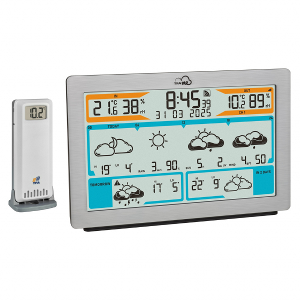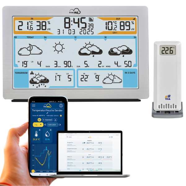 - TFA 35.8100.54 WiFi kablosuz hava durumu istasyonu, wetter.com destekli 3 ila 6 günlük profesyonel yerel hava tahmini sunar; 40’tan fazla hava durumu simgesi ile günlük en yüksek ve en düşük sıcaklık değerleri, yağış olasılığı / miktarı, güneşlenme süresi, UV indeksi ile rüzgar hızı ve yönü gibi detaylı bilgileri gösterebilir.
