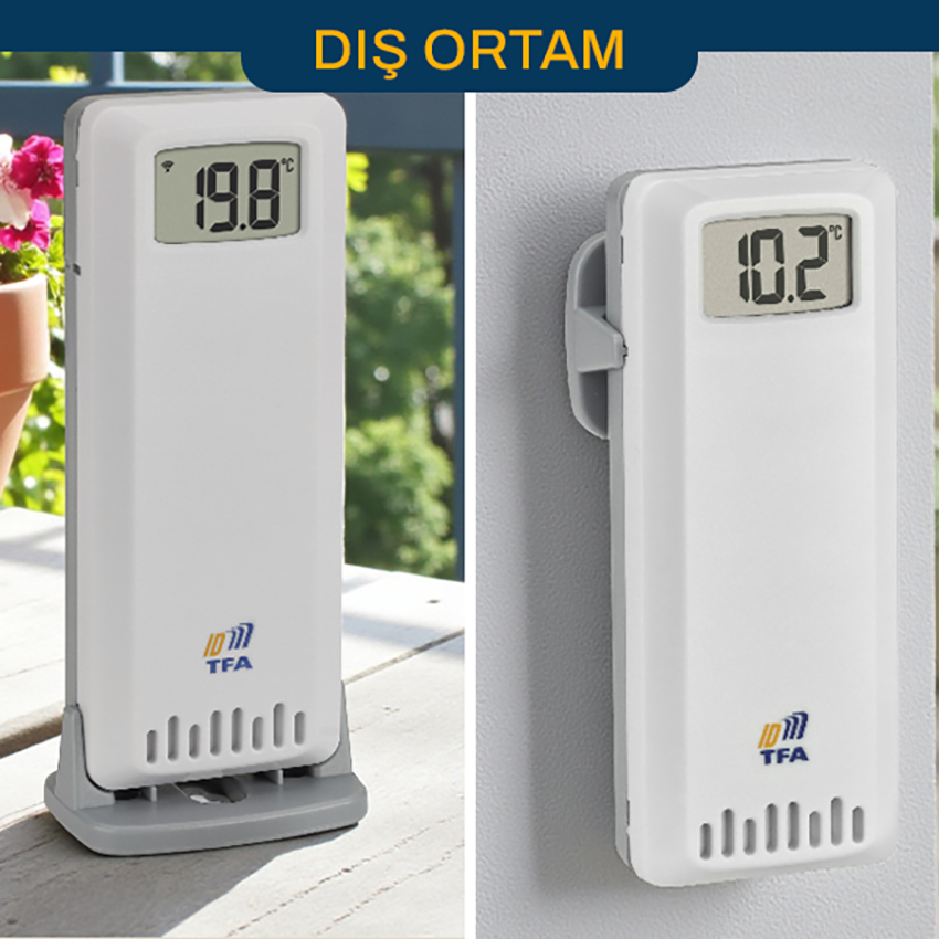 - TFA ana istasyonu iç ortamın sıcaklık ve nemini sürekli ölçerken, paket içerisinden çıkan 3 adet TFA 30.3902.02 sensör hem dış ortam sıcaklığını hem de bağlanabilen prob üzerinden ayrı bir sıcaklık değerini ölçer; sensör ekranında ortam ve prob sıcaklıkları dönüşümlü gösterilirken, ana istasyonda ilgili sensörün yalnızca ortam sıcaklık verisi görüntülenir.