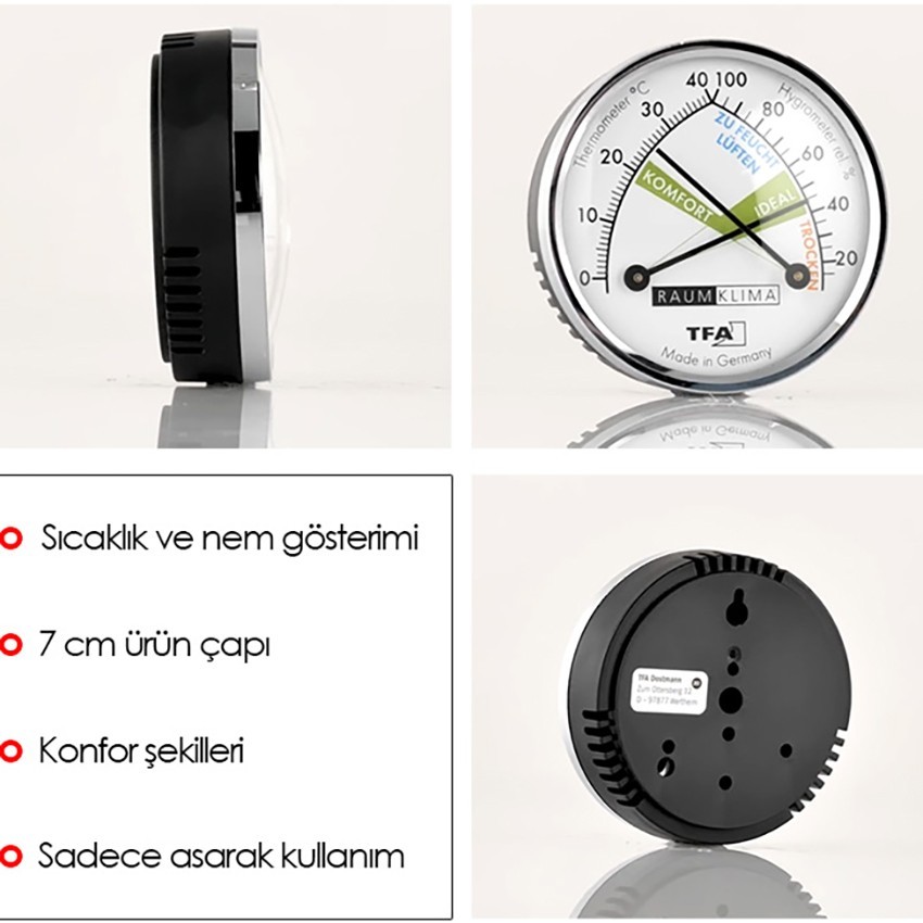 Tfa 45.2024 analog sıcaklık ve nem ölçer, Almanya üretimi orijinal bir cihaz olup, sağlıklı bir iç ortam hava ayarlaması yapmanızı sağlar. Bu analog sıcaklık ve nem ölçer, konfor göstergeli oda termometresi, ve ibreli sıcaklık nem ölçer aramalarında öne çıkar.