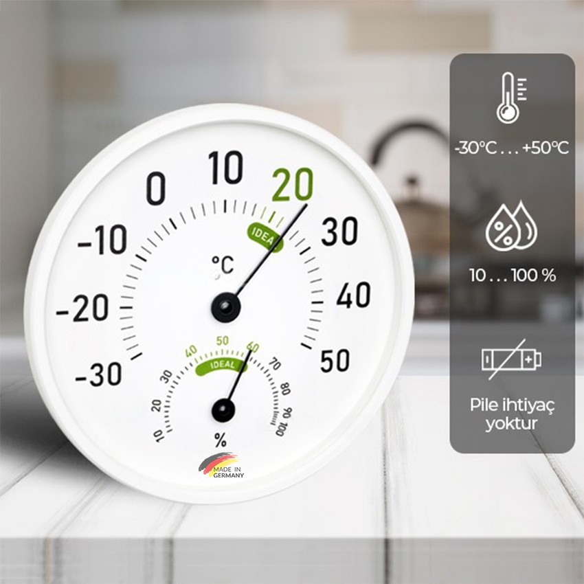 - 131 mm çapındaki bu analog sıcaklık nem ölçüm cihazı geniş ve kaliteli bir ekrana sahiptir.